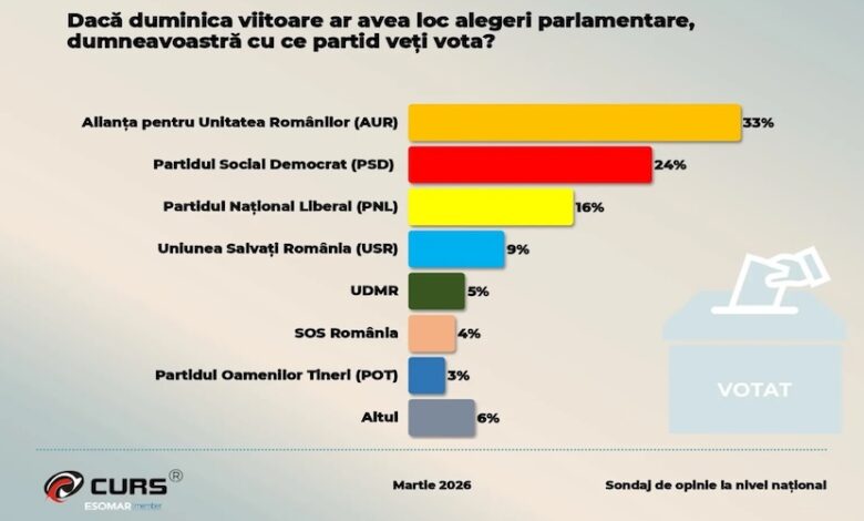 Rezultatele sondajului CURS din martie 2026 arată o schimbare lentă, dar semnificativă, în preferințele electorale ale românilor, pe fondul unei nemulțumiri generalizate legate de situația economică. AUR rămâne lider în intențiile de vot, însă pierde din avans, în timp ce PSD înregistrează o creștere constantă.